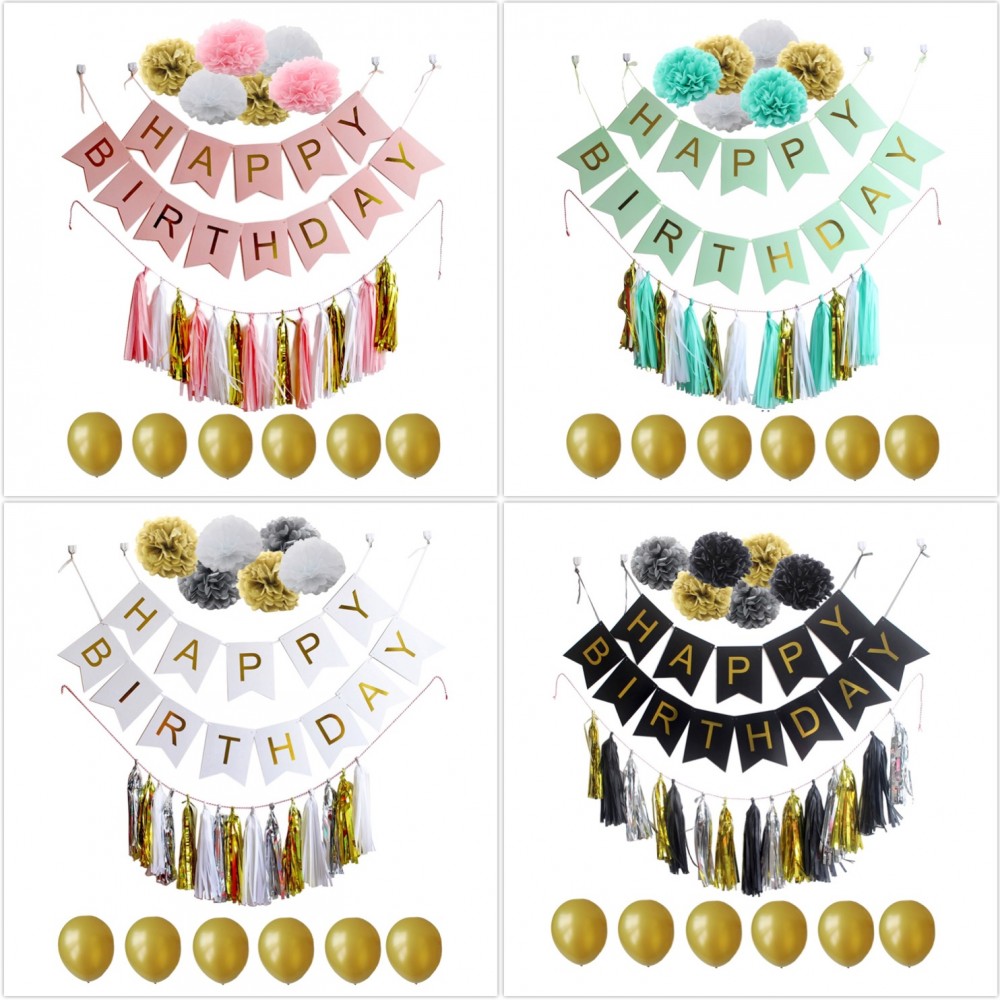 Περιλαμβάνονται: 6 pom poms σε 3 χρώματα, 6 χρυσά 12'' μπαλόνια, 1 μπάνερ Happy Birthday, 15 tissue paper garlands σε 3 χρώματα, κορδόνι δίχρωμο σε λευκό-κόκκινο.